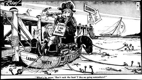 Wilson thus becomes Nelson, blissfully ignorant of long-term political realities (‘IGNORE IT – IT’LL GO AWAY!’) and how splits have bogged down his party – his shipmates are the pro-Europe Roy Jenkins (front-right), who led 69 Labour ministers to cross party lines and vote with the Conservatives for entry to the EEC, and the anti-Europe Michael Foot (rear-left). Rigby underlines the ‘I’ in ‘I SEE NO EUROPE’ to highlight Wilson’s distance from the unions, whose far-left leadership had voted en bloc at recent party conferences in favour of Labour support for pan-European market economics.