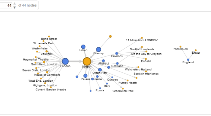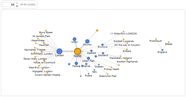 This first graph (using an updated dataset – now up to 188 prints) plots the general place depicted in the print against the specific place depicted. I have given every print a value in each of these columns meaning, for example, there are prints listed as ‘House of Commons‘ (specific) and ‘London’ (general), or ‘On the way to Croydon‘ (specific) and ‘Environs’ (general), or ‘None‘ (specific) and ‘Country’ (general). I’m still to work out a consistent schema for these descriptions, but the network graph based on this information demonstrates a strong relationship between those prints depicting no specific location (central yellow node) and those prints depicting London in general.
