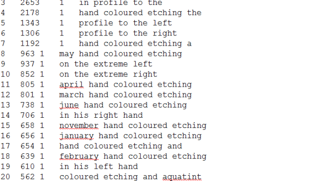 - Language: pushing these texts into AntConc and poking them with concordance measures, ngram counts, and word lists reveals many consistencies. High in the word ranking list (once stop words are removed) are words that navigate us around the prints under examination: ‘hand’, ‘left’, ‘right’, ‘behind’, ‘holds’, ‘says’, ‘wears’, ‘profile’. Even so, discrepancies exist: