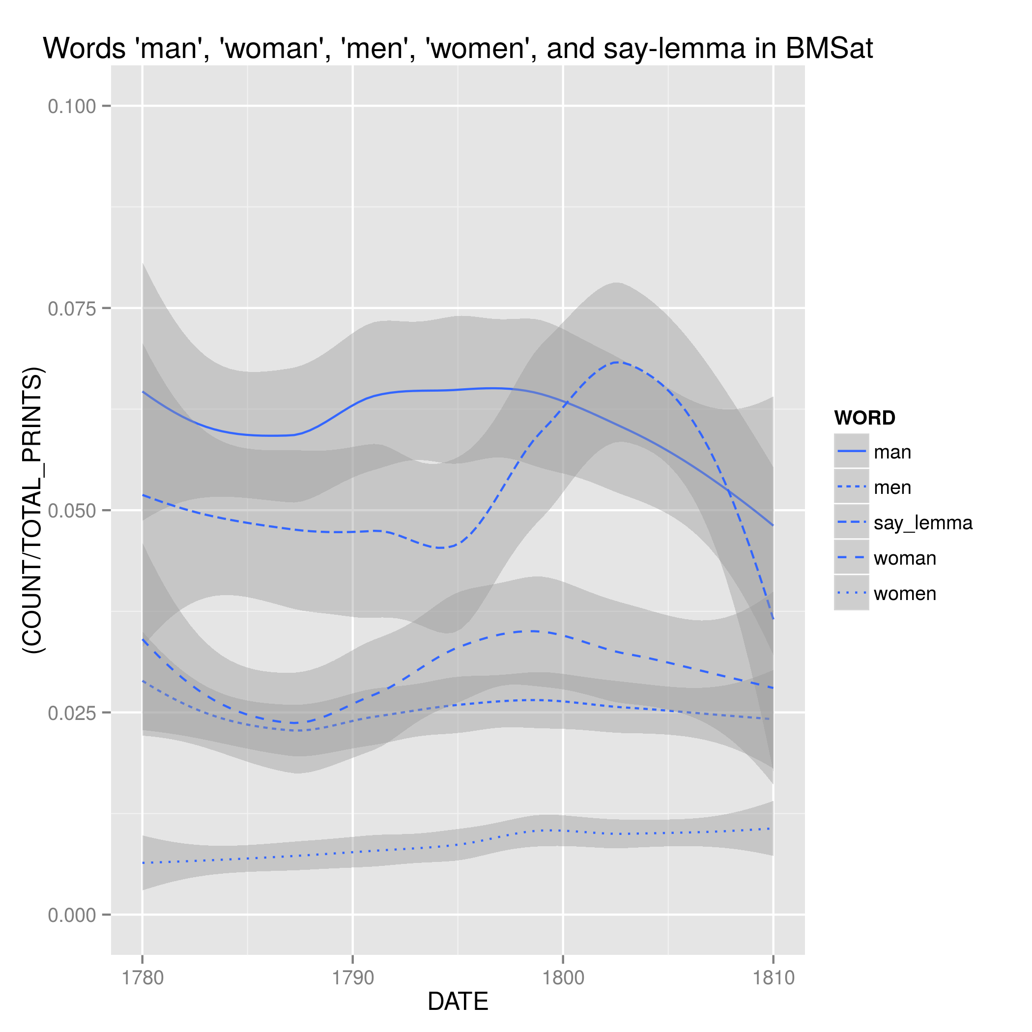 Figure One (code, data) shows the relative annual frequency (count divided by total prints per year) of the words ‘man’, ‘woman’, ‘men’, ‘women’, and say-lemma (say, says, saying, and said) in BMSat between 1780 and 1810. Each thin line is a smoothed mean, the area around it a margin of error. The output is as expected: ‘man’ occurs roughly twice as often as ‘woman’; ‘men’ roughly twice as often as ‘women’. It is notable that by 1810 ‘man’ is well into a decade long decline. Say-lemma is there for context. It is much more spiky and it suggests that there is no obvious correlation between say-lemma and ‘man’, ‘woman’, ‘men’, or ‘women’. This is significant, as we shall see.