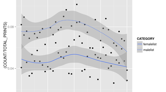 Figure Two (code, data) suggests a similar pattern. It shows the relative annual frequency (again count divided by total prints per year) of the most common male and female category words in BMSat. The category words in question are: