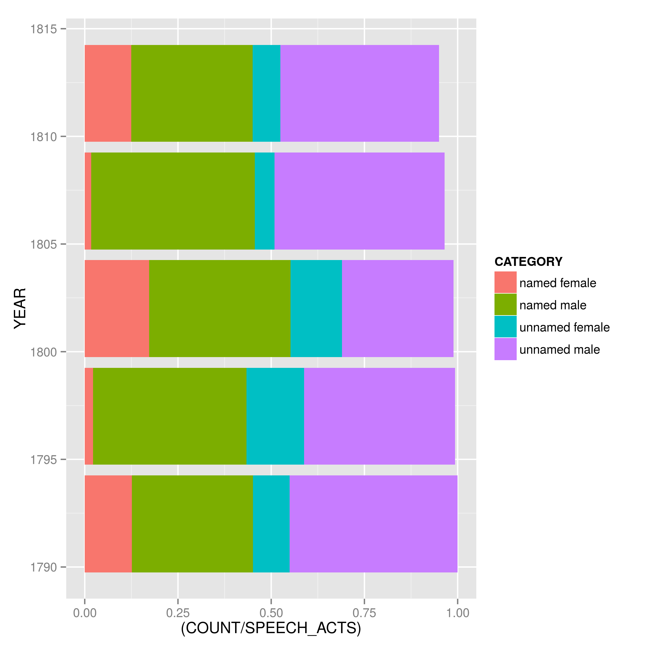 Figure Four (code, data shows every speech act, separated (relative to total speech acts) by whether the speaker is a named female, named male, unnamed female, or unnamed male in prints published by Samuel Fores (a Piccadilly based publisher) on five samples years: 1792, 1797, 1802, 1807, and 1812 (note: this isn’t entirely clear on the graph as I haven’t totally got my head around labelling axis in R yet…). There are bumps here but nothing substantial enough to suggest a longitudinal shift. However if we look at Figure Five (code, data), where the same data is presented relative this time to total prints, there is a clear growth in speech acts in prints from around 1.5 speech acts per prints to nearly 3 per print in 1812 (1797 may be an anomaly, but only a larger sample will confirm or otherwise. Note also, that these figures do take into account prints that contain no speech acts). And so overall there is more speaking going on in Fores prints and more unnamed (especially) male people doing the speaking.