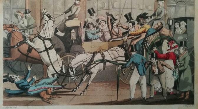This weekend I purchased (for a remarkably modest sum) two prints: Tandem Driving and Wild Fowl Shooting. Both were designed by Henry Alken, engraved by G Hunt, thereafter hand-coloured by an anonymous colourist, and published in 1822 by Thomas McLean from his shop on the Haymarket. They are ‘sporting prints’, light comic scenes as much aimed at the market for cutting up into ‘scraps’ for collaging – a market for ‘relatively unambitious jokes’ that Brian Maidment brings to life in his excellent Comedy, Caricature and the Social Order 1820-1850 – as for framing and appreciating; a market McLean – though little is known of him – was at the forefront of.