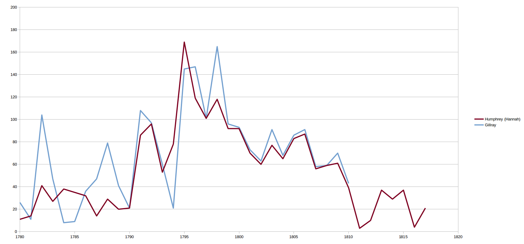 And these data tell some useful stories: that the great collaboration of the age, that of Gillray and Humphrey, was indeed close knit, their output one and the same; but also that this collaboration was (probably) an exception to the rule. Fores, with whom Cruikshank published a majority of prints, could go his own way. So too could Isaac (as he did circa 1795-6) and after his death in 1811 the Cruikshank family – now lead by George and his elder brother Isaac Robert, both satiric engravers – forged fresh partnerships, with men such as William Hone, men whose multi-modal publications that contained image and text in greater harmony than hitherto common would come to define the next era of British graphic satire.